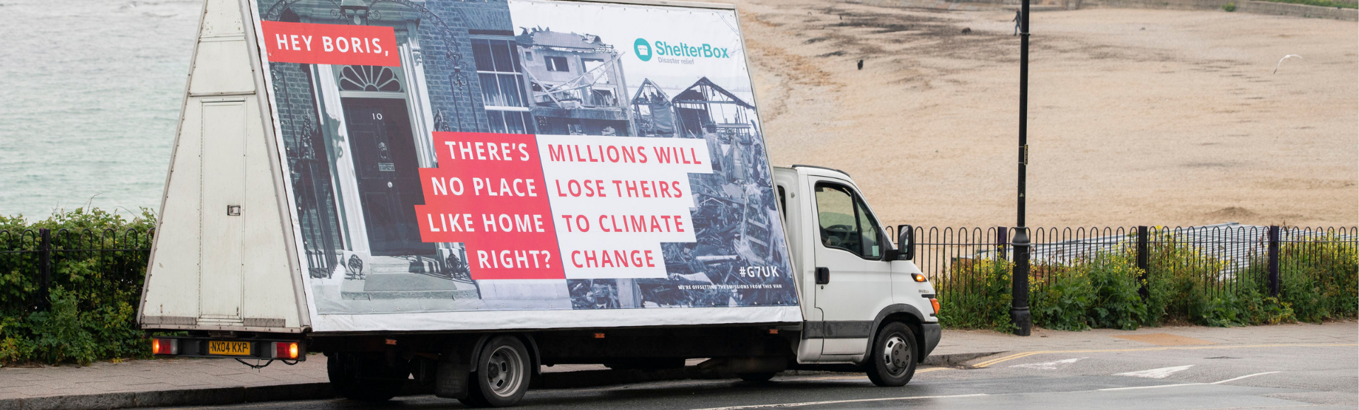 Caption:Sanj Srikanthan, ShelterBox Chief Executive, pictured with the billboardThe charity has a provocative billboard in Cornwall during the G7 summit reminding the Prime Minister that there’s no place like home, urging strong leadership for global solutions and more support for the millions of people losing their homes in the climate crisis.
