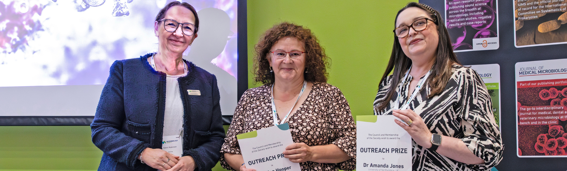 Caption: General Secretary of the Microbiology Society, Professor Karen Robinson, presents Dr Helen Hooper and Dr Amanda Jones from Northumbria University with the 2024 Microbiology Society Outreach Prize. Photo: Courtesy of the Microbiology Society