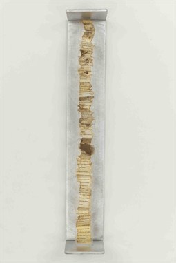 Carolee Schneemann (b.1939) performed Interior Scroll twice. In 1975 at an exhibition of women’s art in East Hampton and, subsequently in 1977, as an unplanned intervention at Telluride Film Festival in Colorado. Both performances consisted of Schneemann removing her clothing, painting upon her naked body, adopting a sequence of static poses, reading from her 1976 book Cézanne She Was a Great Painter, and notoriously culminated in the removal of a scroll from her vagina, which she read aloud to the audience. The artist described the unfurling scroll, which she addressed to other women, ‘like ticker tape, rainbow…plumb line… the umbilicus and tongue’.