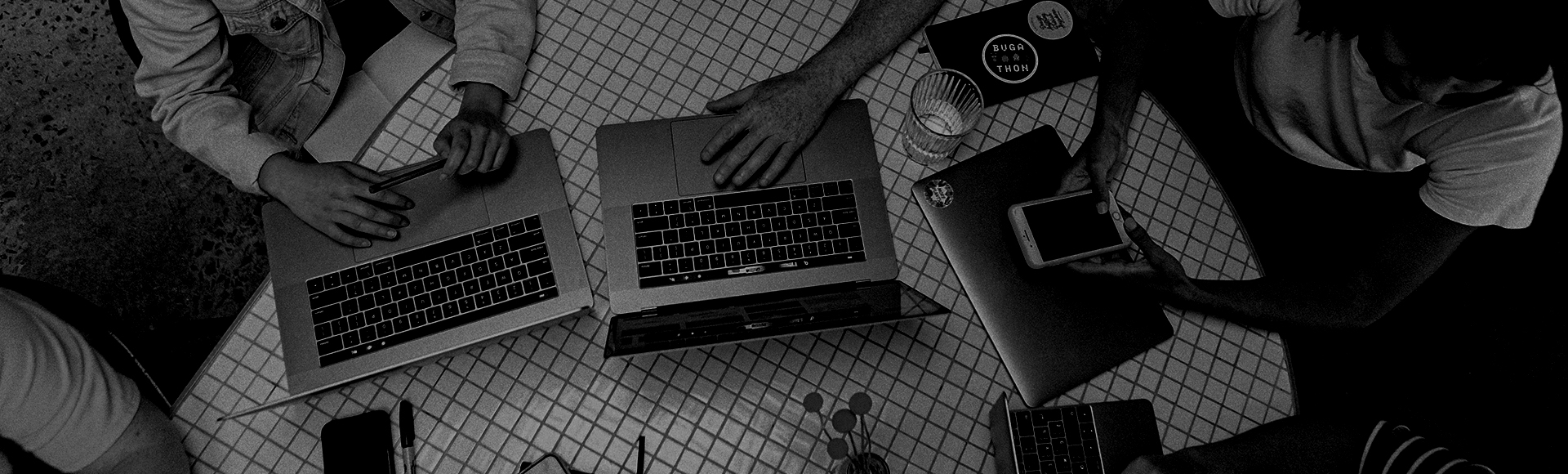 Coffee cup, hand on laptop, hand writing in notebook
